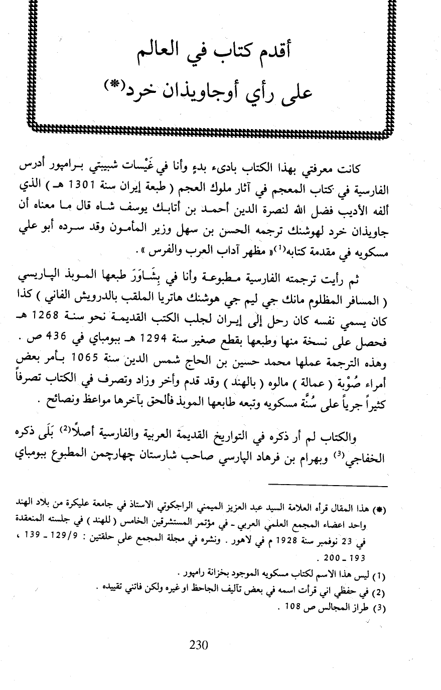 (*) هذا المقال قرأه العلامة السيد عبد العزيز الميمني الراجكوتي الأستاذ في جامعة عليكرة من بلاد الهند وأحد أعضاء المجمع العلمي العربي - في مؤتمر المستشرقين الخامس (للهند) في جلسته المنعقدة في 23 نوفمبر سنة 1928 م في لاهور. ونشره في مجلة المجمع على حلقتين 9/ 129 - 139، 193 - 200.