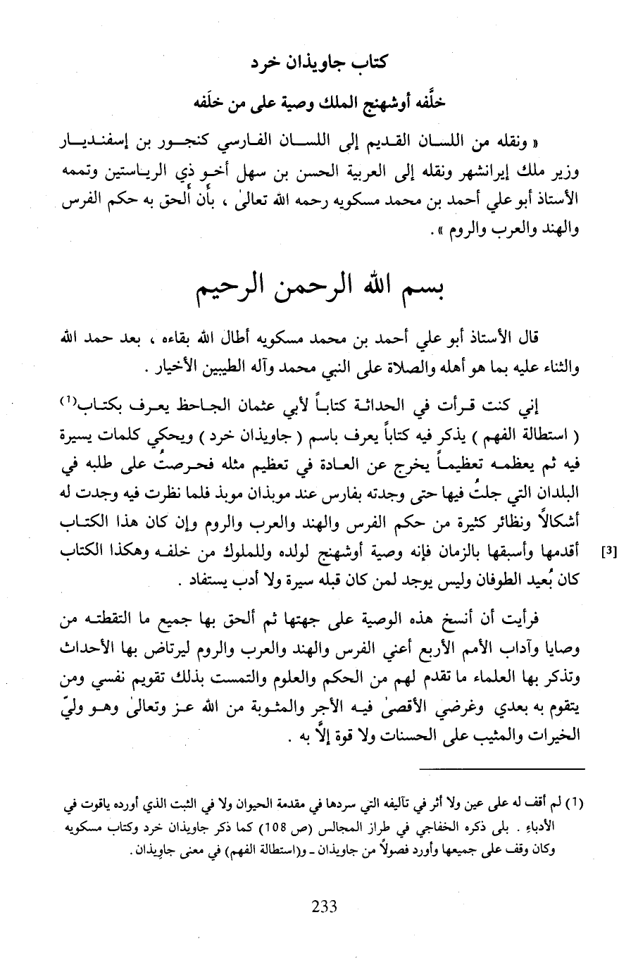 (¬1) لم أقف له على عين ولا أثر في تآليفه التي صردها في مقدمة الحيوان ولا في الثبت الذي أورده ياقوت في الأدباءِ. بلى ذكره الخفاجي في طراز المجالس (ص 108) كما ذكر جاويذان خرد وكتاب مسكويه وكان وقف على جميعها وأورد فصولًا من جاويذان - و (استطالة الفهم) في معنى جاويذان.