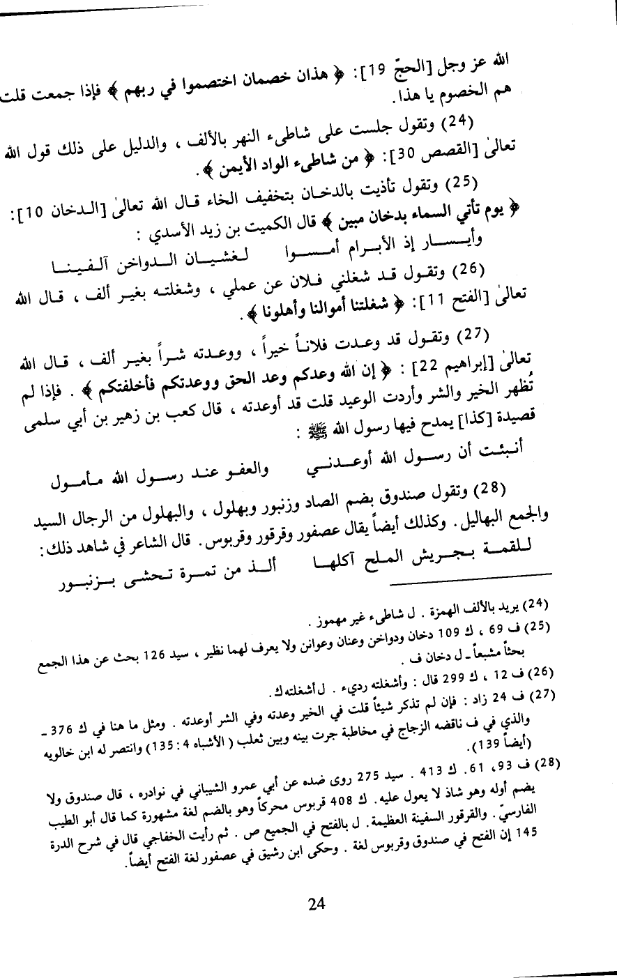 (24) وتقول جلست على شاطئ النهر بالألف، والدليل على ذلك قول الله تعالى [القصص 30]: {مِنْ شَاطِئِ الْوَادِ الْأَيمَنِ}.