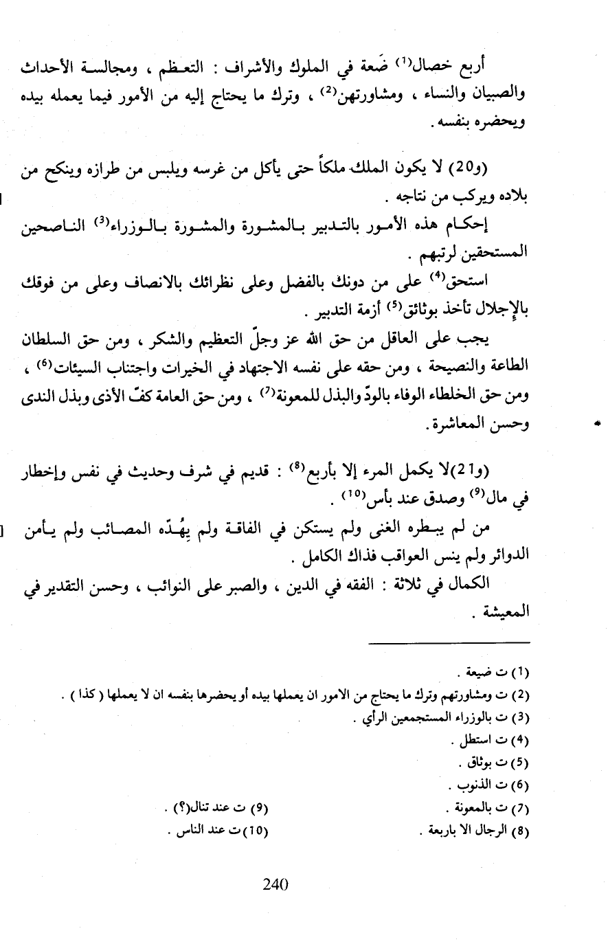 (و 20) لا يكون الملك ملكًا حتى يأكل من غرسه ويلبس من طرازه وينكح من بلاده ويركب من نتاجه.