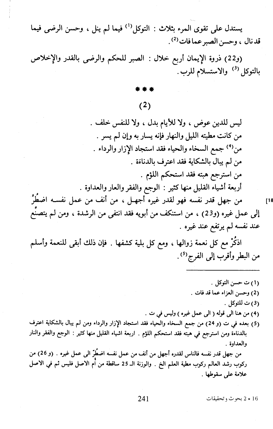 (¬5) بعده في ت (و 24) من جمع السخاء والحياء فقد استجاد الإِزار والرداء ومن لم يبال بالشكاية اعترف بالدناءة ومن استرجع في هبته فقد استحكم اللؤم. أربعة أشياء القليل منها كثير: الوجع والفقر والنار والعداوة.