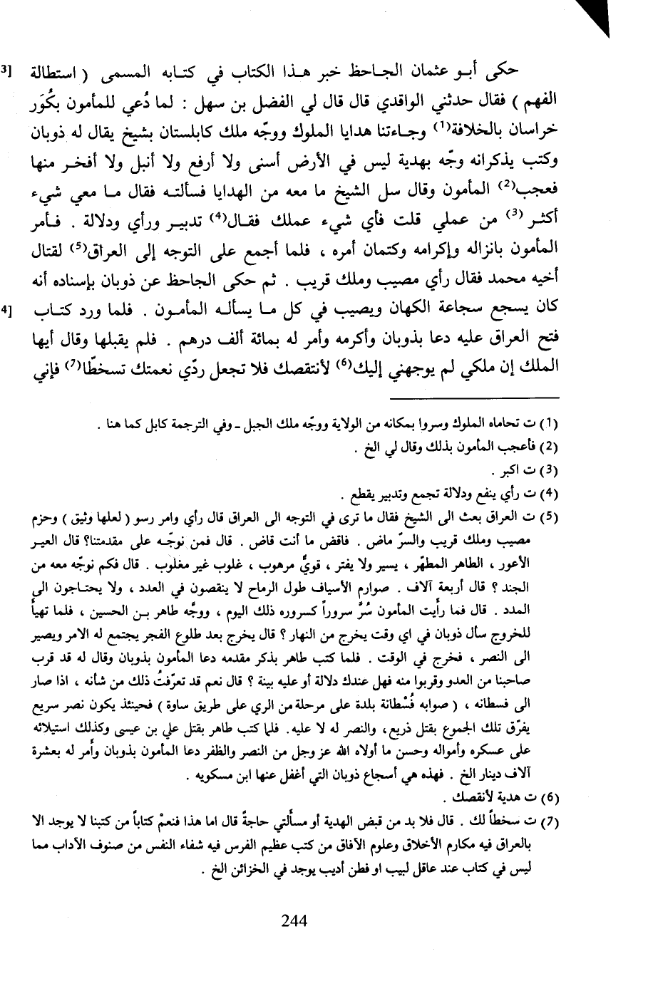(¬7) ت سخطًا لك. قال فلا بد من قبض الهدية أو مسأَلتي حاجةً قال أما هذا فنعم كتابًا من كتبنا لا يوجد إلا بالعراق فيه مكارم الأخلاق وعلوم الآفاق من كتب عظيم الفرس فيه شفاء النفس من صنوف الآداب مما ليس في كتاب عند عاقل لبيب أو فطن أديب يوجد في الخزائن الخ.