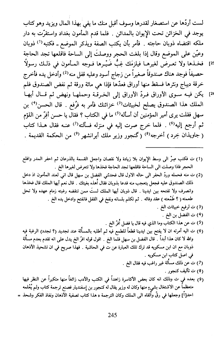 (¬6) ت إليه أمرته أن لا يفتح بين أيدينا قطعًا للطمع فيه ثم أطلبه بالمسأَلة عند تجديد (؟ تجدد) الرغبة فيه والله لا كان هذا أبدًا. قال الفضل بن سهل فلما الخ. أقول قوله افرّ الخ يدل على أنه تقدم بعدم مسأَلة ذوبان مع أن ابن مسكويه قد ترك تلك العبارة عن ت في الحاشية. فهذا صريح في أن تشحيذ الأذهان في أصل كتاب ابن مسكويه.