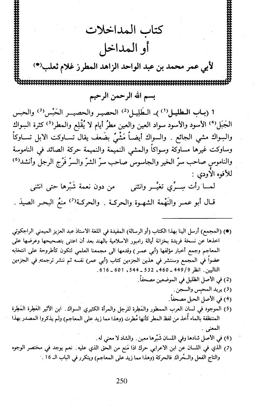 كتاب المداخلات أو المداخل لأبي عمر محمد بن عبد الواحد الزاهد المطرز غلام ثعلب (*)