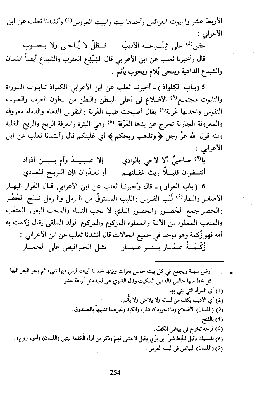 6 (باب العرار) - قال وأخبرنا ثعلب عن ابن الأعرابي قال العَرار البهار الأصفر والبهار (¬7) لَبَب الفرس واللبب المسترقّ من الرمل والرمل نسج الحُصُر والحصر جمع الحَصور والحصور الذي لا يحب النساء والمحب البعير المتعَب والمتعب المملوء من الآنية والمملوء المزكوم والمزكوم الولد الملقى يقال زكمت به أمه فهو زُكمة وهو موحد في جميع الحالات قال أنشدنا ثعلب عن ابن الأعرابي: