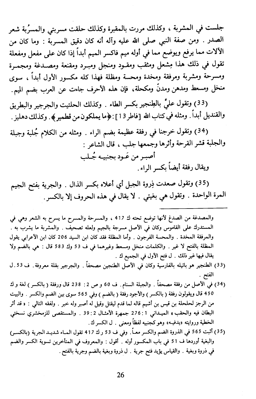 (35) أثبت 565 في الذروة الضم والكسر معًا. وفي ف 53 ر ك 417 تقول الماء شديد الجرية (بالكسر) والبغية أوردها ف 51 في باب المكسور أوله. أقول: والمعروف في المتأخرين تسوية الكسر والضم في ذروة وبغية. والقياس يؤيد فتح جرية. ل ذروة وبغية بالضم وجرية بالفتح.