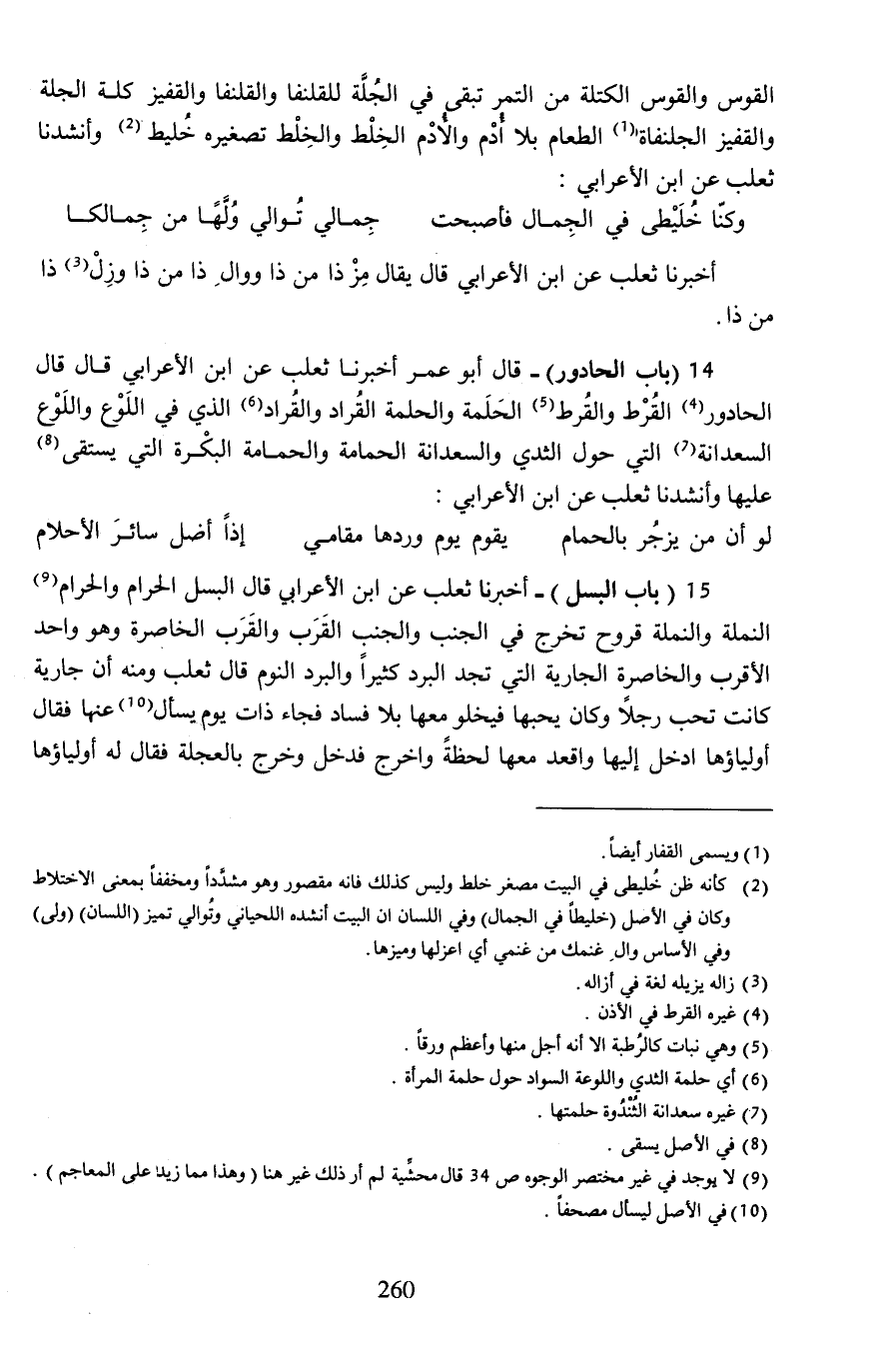 14 (باب الحادور) - قال أبو عمر أخبرنا ثعلب عن ابن الأعرابي قال قال الحادور (¬4) القُرْط والقُرط (¬5) الحَلَمة والحلمة القُراد والقُراد (¬6) الذي في اللَوْع واللَوْع السعدانة (¬7) التي حول الثدي والسعدانة الحمامة والحمامة البكْرة التي يستقى (¬8) عليها وأنشدنا ثعلب عن ابن الأعرابي: