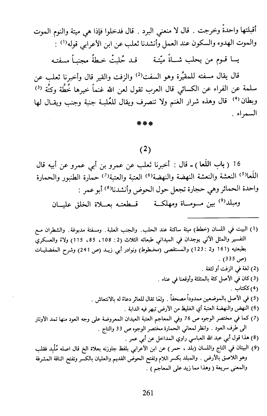 16 (باب اللَعا) - قال: أخبرنا ثعلب عن عمرو بن أبي عمرو عن أبيه قال اللَعا (¬5) النعشة والنعشة النهضة والنهضة (¬6) العتبة والعتبة (¬7) حمارة الطنبور والحمارة واحدة الحمائر وهي حجارة تجعل حول الحوض وأنشدنا (¬8) أبو عمر:
