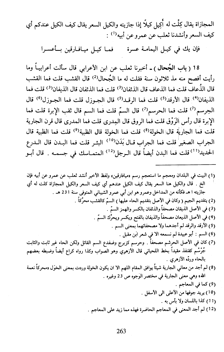 18 (باب الجُحال) - أخبرنا ثعلب عن ابن الأعرابي قال سألت أعرابيًّا وما رأيت أفصح منه مذ ثلاثون سنة فقلت له ما الجُحال (¬2) قال القشب قلت فما القشب قال الذُعاف قلت فما الذعاف قال الذئفان (3) قلت فما الذئفان قال الذيفان (¬3) قلت فما الذيفان (¬4) قال الأرقد (5) قلت فما الرقد (¬5) قال الجوزل قلت فما الجوزل (¬6) قال الحِرسم (¬7) قلت فما الحرسم (7) قال السم قلت فما السم قال ثقب الإِبرة قلت فما الإِبرة قال رأس الرَوْق قلت فما الروق قال المِدرى قلت فما المدرى قال قرن الجارية قلت فما الجارية قال الخولة (¬8) قلت فما الخولة قال الظبية (¬9) قلت فما الظبية قال الجراب الصغير قلت فما الجراب قال بَدَن (¬10) البئر قلت فما البدن قال الدرع الحديد (¬11) قلت فما البدن أيضًا قال الرجل (¬12) المتماسك في جسمه. قال أبو