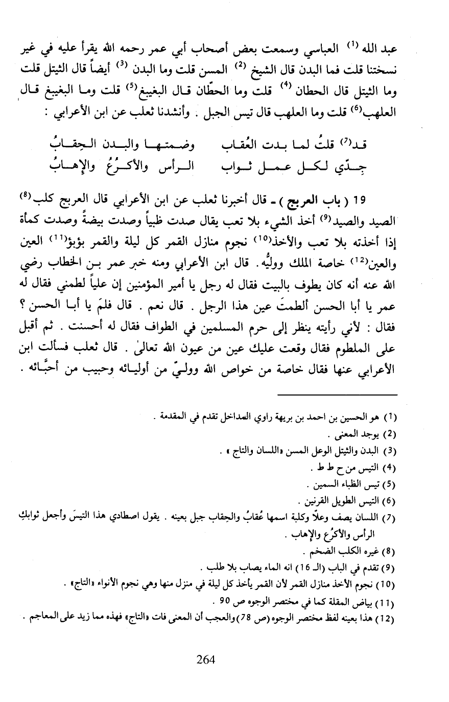 19 (باب العربج) - قال أخبرنا ثعلب عن ابن الأعرابي قال العربج كلب (¬8) الصيد والصيد (¬9) أخذ الشيء بلا تعب يقال صدت ظبيًا وصدت بيضةً وصدت كمأة إذا أخذته بلا تعب والأخذ (¬10) نجوم منازل القمر كل ليلة والقمر بؤبؤ (¬11) العين والعين (¬12) خاصة الملك ووليه. قال ابن الأعرابي ومنه خبر عمر بن الخطاب رضي الله عنه أنه كان يطوف بالبيت فقال له رجل يا أمير المؤمنين إن عليًّا لطمني فقال له عمر يا أبا الحسن ألطمتَ عين هذا الرجل. قال نعم. قال فلمَ يا أبا الحسن؟ فقال: لأني رأيته ينظر إلى حرم المسلمين في الطواف فقال له أحسنت. ثم أقبل على الملطوم فقال وقعت عليك عين من عيون الله تعالى. قال ثعلب فسألت ابن الأعرابي عنها فقال خاصة من خواص الله وولي من أوليائه وحبيب من أحبائه.