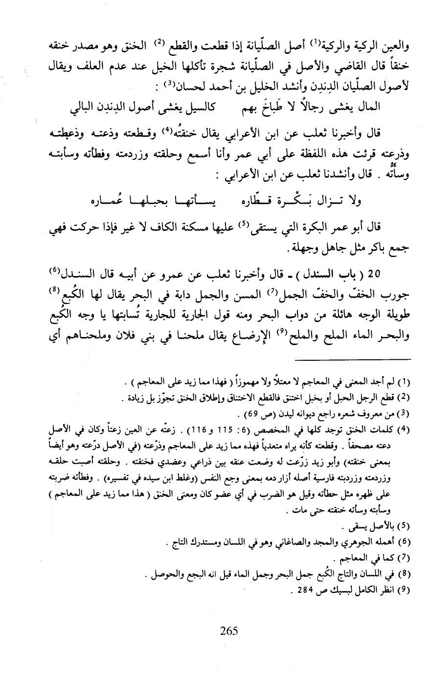 20 (باب السندل) - قال وأخبرنا ثعلب عن عمرو عن أبيه قال السندل (¬6) جورب الخفّ والخف الجمل (¬7) المسن والجمل دابة في البحر يقال لها الكُبع (¬8) طويلة الوجه هائلة من دواب البحر ومنه قول الجارية للجارية تُسابتها يا وجه الكبع والبحر الماء الملح والملح (¬9) الإِرضاع يقال ملحنا في بني فلان وملحناهم أي