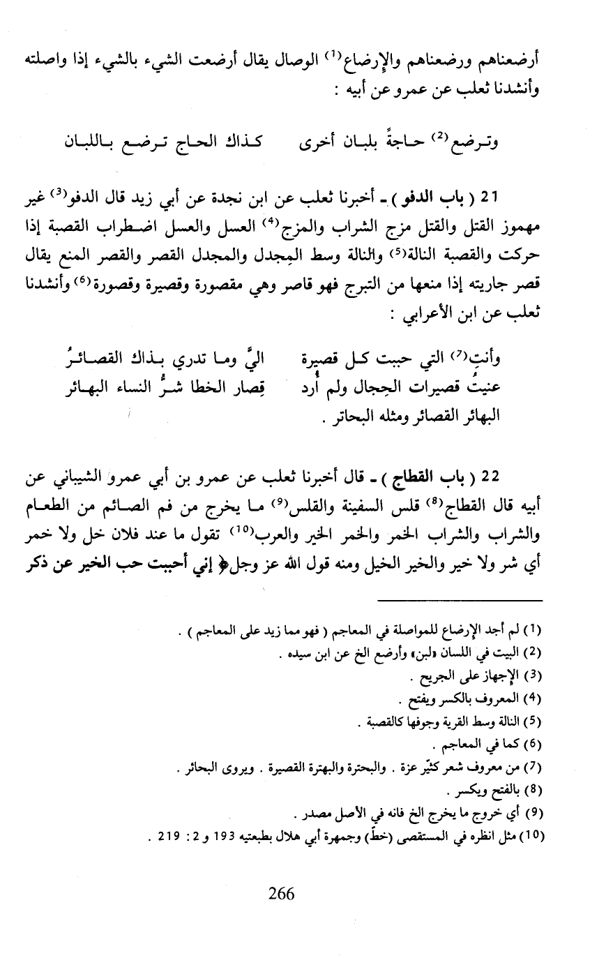 21 (باب الدفو) - أخبرنا ثعلب عن ابن نجدة عن أبي زيد قال الدفو (¬3) غير مهموز القتل والقتل مزج الشراب والمزج (¬4) العسل والعسل اضطراب القصبة إذا حركت والقصبة النالة (¬5) والنالة وسط المِجدل والمجدل القصر والقصر المنع يقال قصر جاريته إذا منعها من التبرج فهو قاصر وهي مقصورة وقصيرة وقصورة (¬6) وأنشدنا ثعلب عن ابن الأعرابي: