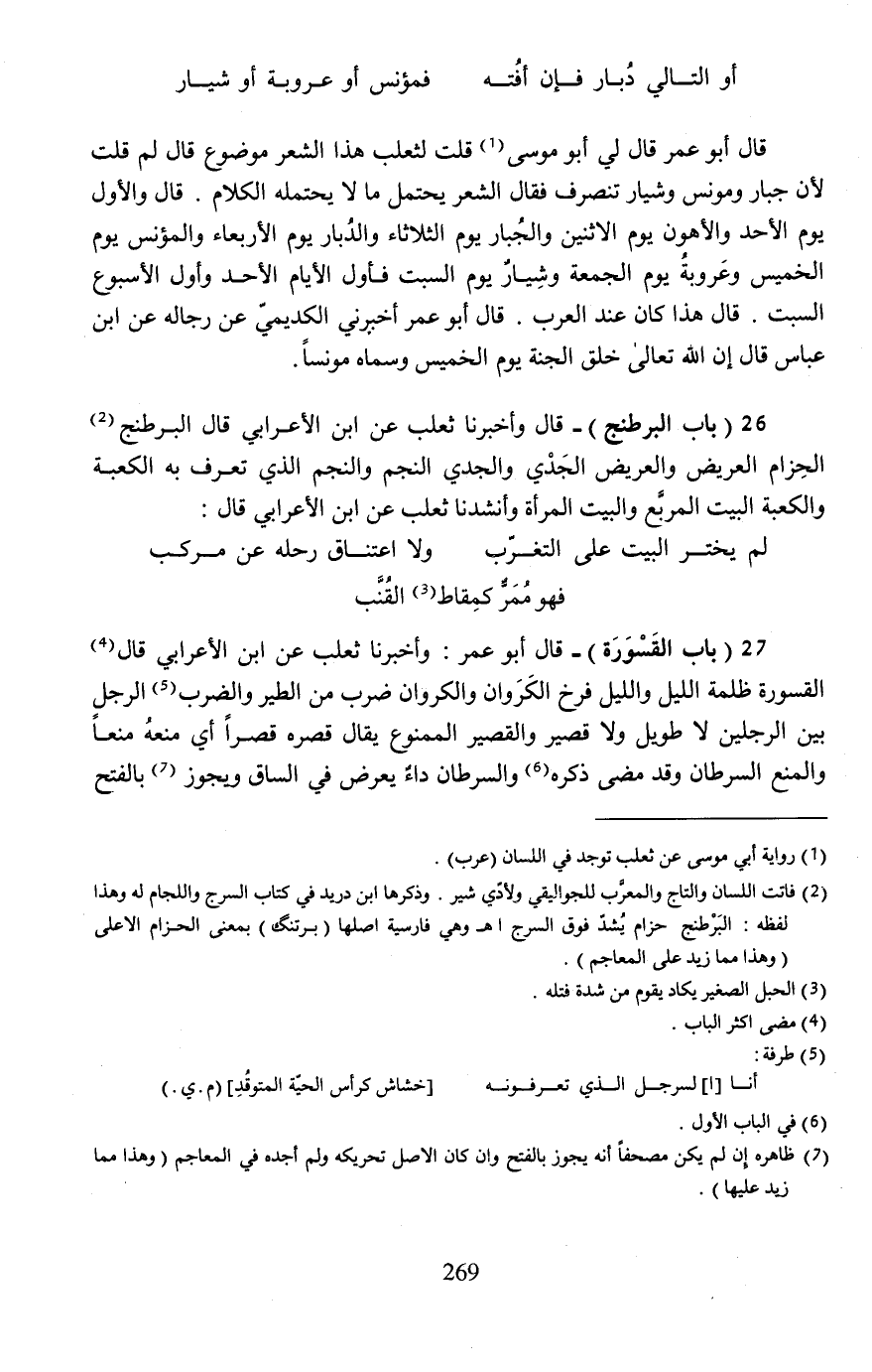 26 (باب البرطنج) - قال وأخبرنا ثعلب عن ابن الأعرابي قال البرطنج (¬2) الحِزام العريض والعريض الجَدْي والجدي النجم والنجم الذي تعرف به الكعبة والكعبة البيت المربع والبيت المرأة وأنشدنا ثعلب عن ابن الأعرابي قال: