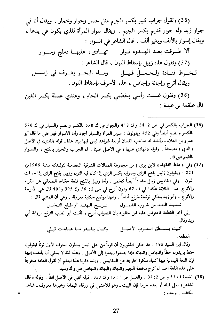 (37) وفي "غلط الفقهاء" لابن بري (من مجموعة المقالات الشرقية المقدمة لنولدكه سنة 1906 م) 221: ويقولون زنبيل بفتح الزاي وصوابه بكسر الزاي إذا كان فيه النون وزبيل بفتح الزاي إذا حذفت النون. وفي القاموس زبيل مشددًا أيضًا كخمير. وأما زنبيل بالفتح فلغة حكاها الصغاني عن الفراء والأترج اهـ. الثلاثة هكذا في ف 67 ودون أترج في ص 2: 36 وك 395 و 401 قال هي الأترجة والأترج، وأبو زيد يحكي ترنجة وترنج أيضًا. وها هنا موضع حكاية معروفة. وهي أن المتنبي قال: