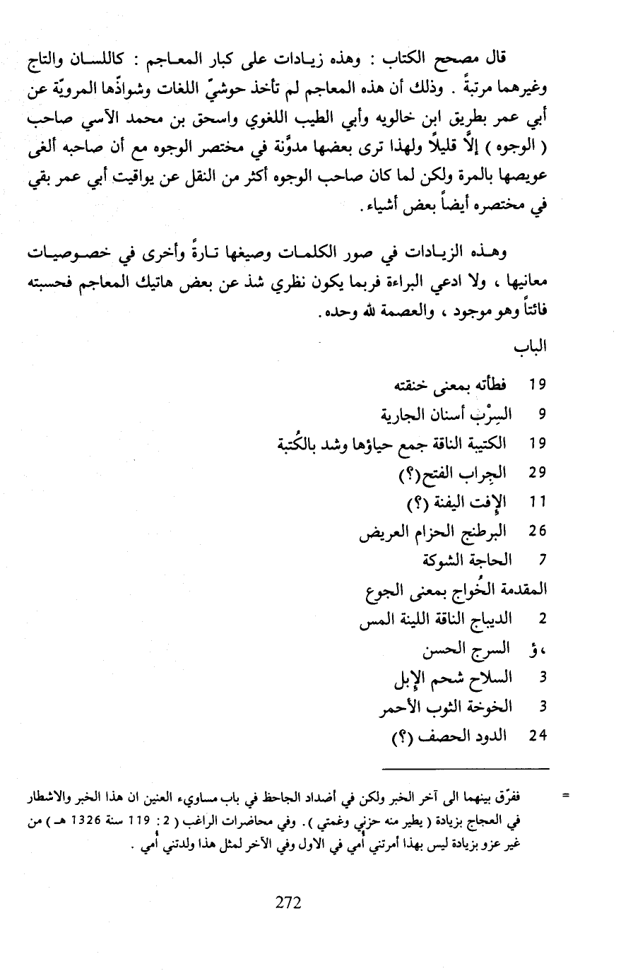 قال مصحح الكتاب: وهذه زيادات على كبار المعاجم: كاللسان والتاج وغيرهما مرتبةً. وذلك أن هذه المعاجم لم تأخذ حوشي اللغات وشواذّها المروية عن أبي عمر بطريق ابن خالويه وأبي الطيب اللغوي وإسحاق بن محمَّد الآسي صاحب (الوجوه) إلَّا قليلا ولهذا ترى بعضها مدوَّنة في مختصر الوجوه مع أن صاحبه ألغى عويصها بالمرة ولكن لما كان صاحب الوجوه أكثر من النقل عن يواقيت أبي عمر بقي في مختصره أيضًا بعض أشياء.