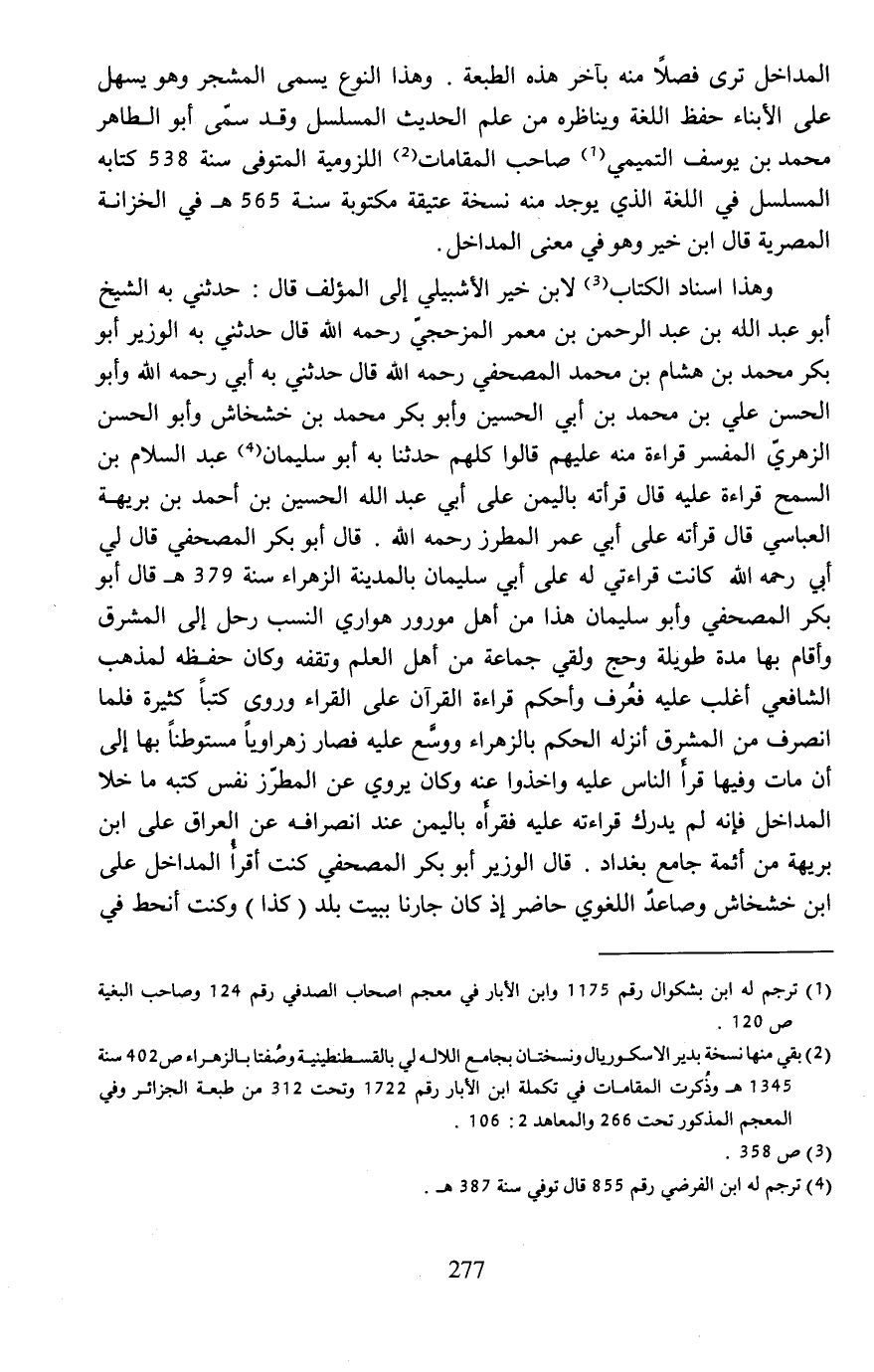 المداخل ترى فصلًا منه بآخر هذه الطبعة. وهذا النوع يسمى المشجر وهو يسهل على الأبناء حفظ اللغة ويناظره من علم الحديث المسلسل وقد سمى أبو الطاهر محمَّد بن يوسف التميمي (¬1) صاحب المقامات (¬2) اللزومية المتوفي سنة 538 كتابه المسلسل في اللغة الذي يوجد منه نسخة عتيقة مكتوبة سنة 565 هـ في الخزانة المصرية قال ابن خير وهو في معنى المداخل.