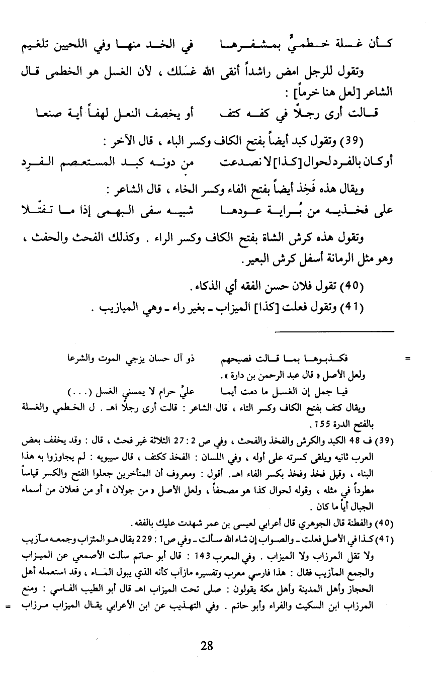 (39) ف 48 الكبد والكرش والفخذ والفحث، وفي ص 2: 27 الثلاثة غير فحث، قال: وقد يخفف بعض العرب ثانيه ويلقى كسرته على أوله، وفي اللسان: الفخذ ككتف، قال سيبويه: لم يجاوزوا به هذا البناء، وقيل فخذ وفخذ بكسر الفاء اهـ. أقول: ومعروف أن المتأخرين جعلوا الفتح والكسر قياسًا مطردًا في مثله، وقوله لحوال كذا هو مصحفًا، ولعل الأصل "من جولان" أو من فعلان من أسماء الجبال أيًّا ما كان.