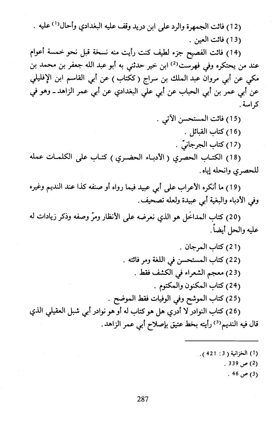 (12) فائت الجمهرة والرد على ابن دريد وقف عليه البغدادي وأحال (¬1) عليه.