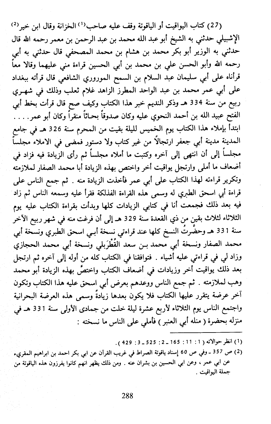 (¬2) ص 357 - وفي ص 60 إسناد ياقوتة الصراط في غريب القرآن عن أبي بكر أحمد بن إبراهيم المقرئ عن أبي عمر، وعن أبي الحسين بن بشران عنه. ومن ذلك يظهر انهم كانوا يفرزون هذه الياقوتة بن جملة اليواقيت.