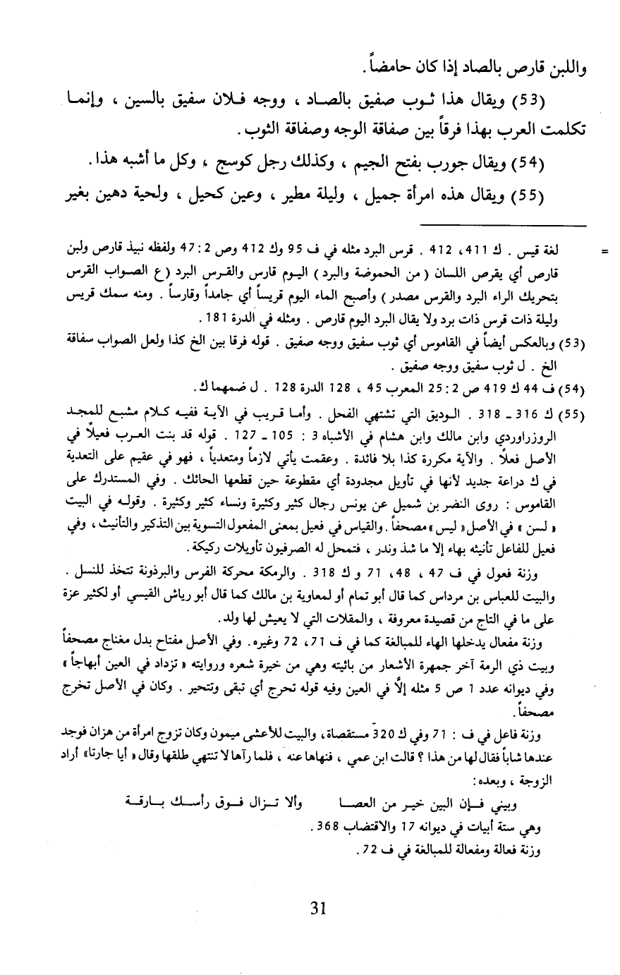 (55) ك 316 - 318. الوديق التي تشتهي الفحل. وأما قريب في الآية ففيه كلام مشبع للمجد الروزراوردي وابن مالك وابن هشام في الأشباه 3: 105 - 127. قوله قد بنت العرب فعيلًا في الأصل فعلًا. والآية مكررة كذا بلا فائدة. وعقمت يأتي لازمًا ومتعديًا، فهو في عقيم على التعدية في ك دراعة جديد لأنها في تأويل مجدودة أي مقطوعة حين تطعها الحائك. وفي المستدرك على القاموس: روى النضر بن شميل عن يونس رجال كثير وكثيرة ونساء كثير وكثيرة. وقوله في البيت "لسن" في الأصل "ليس" مصحفًا. والقياس في فعيل بمعنى المفعول التسوية بين التذكير والتأنيث، وفي فعيل للفاعل تأنيثه بهاء إلا ما شذ وندر، فتمحل له الصرفيون تأويلات ركيكة.