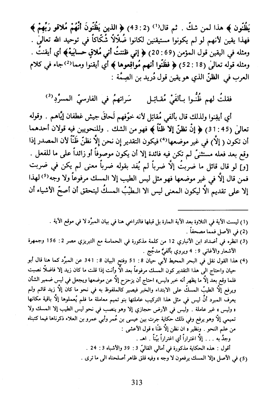 يَظُنُّونَ} هذا لمن شكّ. ثم قال (¬1) (2: 46) {الَّذِينَ يَظُنُّونَ أَنَّهُمْ مُلَاقُو رَبِّهِمْ} فهذا يقين لأنهم لو لم يكونوا مستيقنين لكانوا ضُلّالًا شُكّاكًا في توحيد الله تعالى. ومثله في اليقين قول المؤمن (69: 20) {إِنِّي ظَنَنْتُ أَنِّي مُلَاقٍ حِسَابِيَهْ} أي أيقنتُ. ومثله قوله تعالى (18: 53) {فَظَنُّوا أَنَّهُمْ مُوَاقِعُوهَا} أي أيقنوا ومما (¬2) جاء في كلام العرب في الظنّ الذي هو يقين قول دُريد بن الصِمَّة: