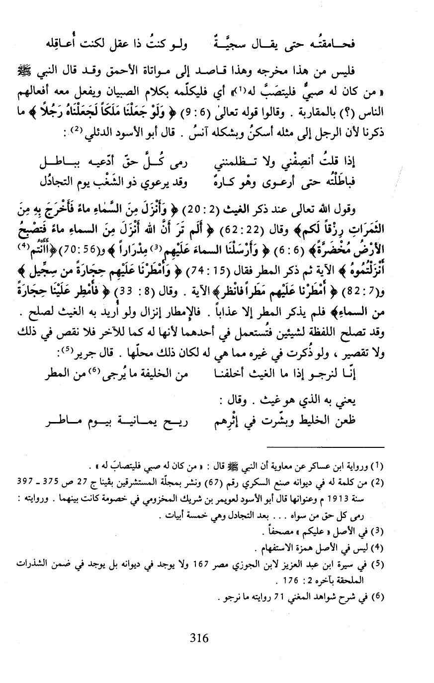 وقول الله تعالى عند ذكر الغيث (2: 20) {وَأَنْزَلَ مِنَ السَّمَاءِ مَاءً فَأَخْرَجَ بِهِ مِنَ الثَّمَرَاتِ رِزْقًا لَكُمْ} وقال (22: 63) {أَلَمْ تَرَ أَنَّ اللَّهَ أَنْزَلَ مِنَ السَّمَاءِ مَاءً فَتُصْبِحُ الْأَرْضُ مُخْضَرَّةً} (6: 6) {وَأَرْسَلْنَا السَّمَاءَ عَلَيهِمْ (¬3) مِدْرَارًا} و (56: 69) {أَأَنْتُمْ (¬4) أَنْزَلْتُمُوهُ} الآية ثم ذكر المطر فقال (15: 74) {وَأَمْطَرْنَا عَلَيهِمْ حِجَارَةً مِنْ سِجِّيلٍ} و (7: 82) {وَأَمْطَرْنَا عَلَيهِمْ مَطَرًا فَانْظُرْ} الآية. وقال (8: 32) {فَأَمْطِرْ عَلَينَا حِجَارَةً مِنَ السَّمَاءِ} فلم يذكر المطر إلا عذابًا. فالإِمطار إنزال ولو أُريد به الغيث لصلح. وقد تصلح اللفظة لشيئين فتُستعمل في أحدهما لأنها له كما للآخر فلا نقص في ذلك ولا تقصير، ولو ذُكرت في غيره مما هي له لكان ذلك محلّها. قال جرير (¬5):