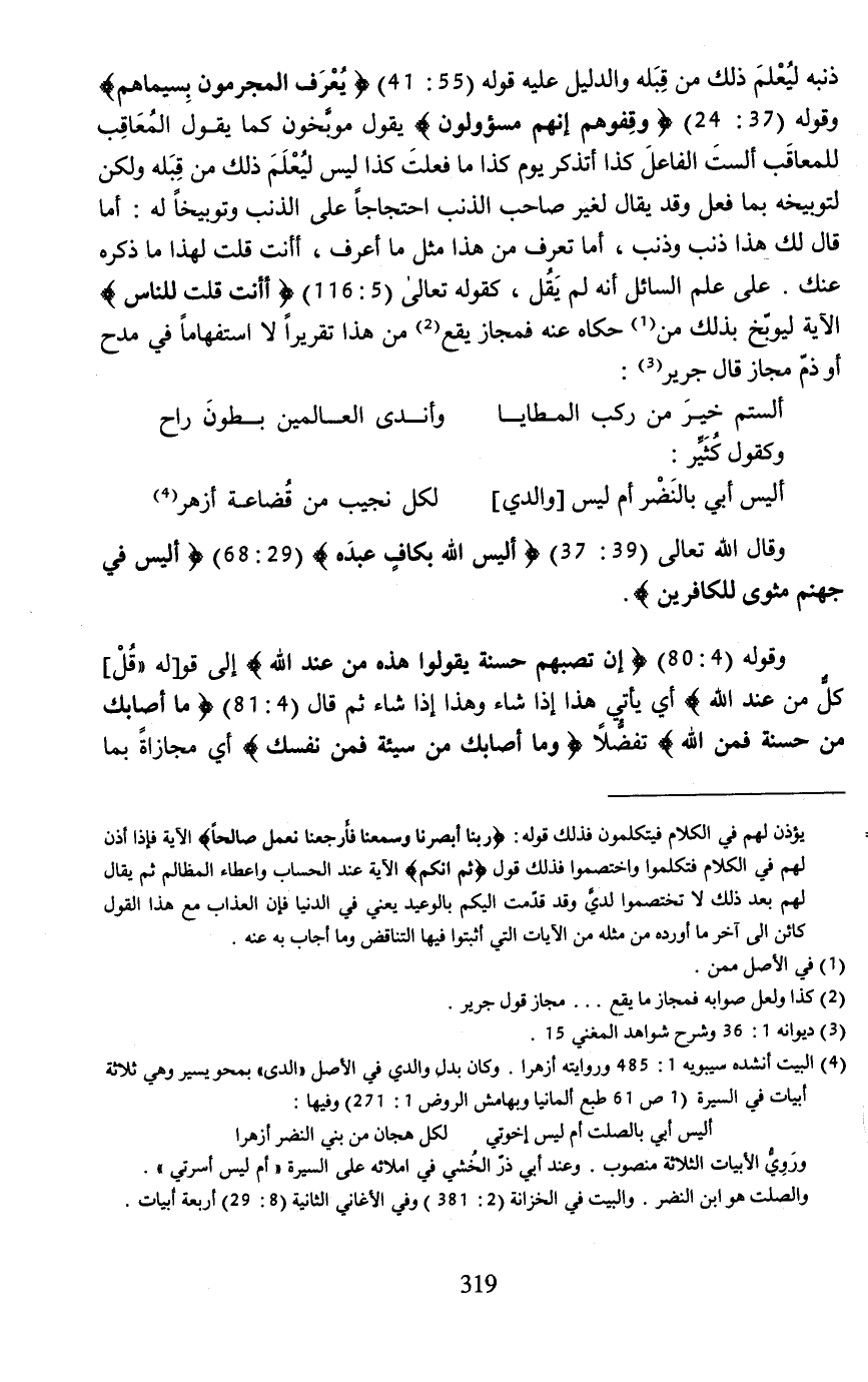 ذنبه ليُعْلمَ ذلك من قِبَله والدليل عليه قوله (55: 41) {يُعْرَفُ الْمُجْرِمُونَ بِسِيمَاهُمْ} وقوله (37: 24) {وَقِفُوهُمْ إِنَّهُمْ مَسْئُولُونَ} يقول موبَّخون كما يقول المُعَاقِب للمعاقَب ألستَ الفاعلَ كذا أتذكر يوم كذا ما فعلتَ كذا ليس ليُعْلَمَ ذلك من قِبَله ولكن لتوبيخه بما فعل وقد يقال لغير صاحب الذنب احتجاجًا على الذنب وتوبيخًا له: أما قال لك هذا ذنب وذنب، أما تعرف من هذا مثل ما أعرف، أأنت قلت لهذا ما ذكره عنك. على علم السائل أنه لم يَقُل، كقوله تعالى (5: 116) {أَأَنْتَ قُلْتَ لِلنَّاسِ} الآية ليوبّخ بذلك من (¬1) حكاه عنه فمجاز يقع (¬2) من هذا تقريرًا لا استفهامًا في مدح أو ذمّ مجاز قال جرير (¬3):