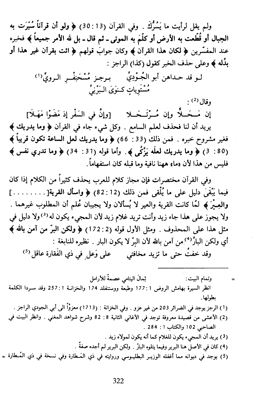 وفي القرآن مختصرات فإن مجاز كلام للعرب يحذف كثيرًا من الكلام إذا كان فيما يَبْقَى دليل على ما يُلْقى فمن ذلك (12: 82) {وَاسْأَلِ الْقَرْيَةَ [........] وَالْعِيرَ} لمّا كانت القرية والعير لا يُسألان ولا يجيبان عُلم أن المطلوب غيرهما. ولا يجوز على هذا جاء زيد وأنت تريد غلام زيد لأن المجيء يكون له (¬3) ولا دليل في مثل هذا على المحذوف. ومثل الأول قوله (2: 172) {وَلَكِنَّ الْبِرَّ مَنْ آمَنَ بِاللَّهِ} أي ولكن البارَّ (¬4) من آمن بالله لأن البِّر لا يكون البار. نظيره للنابغة: