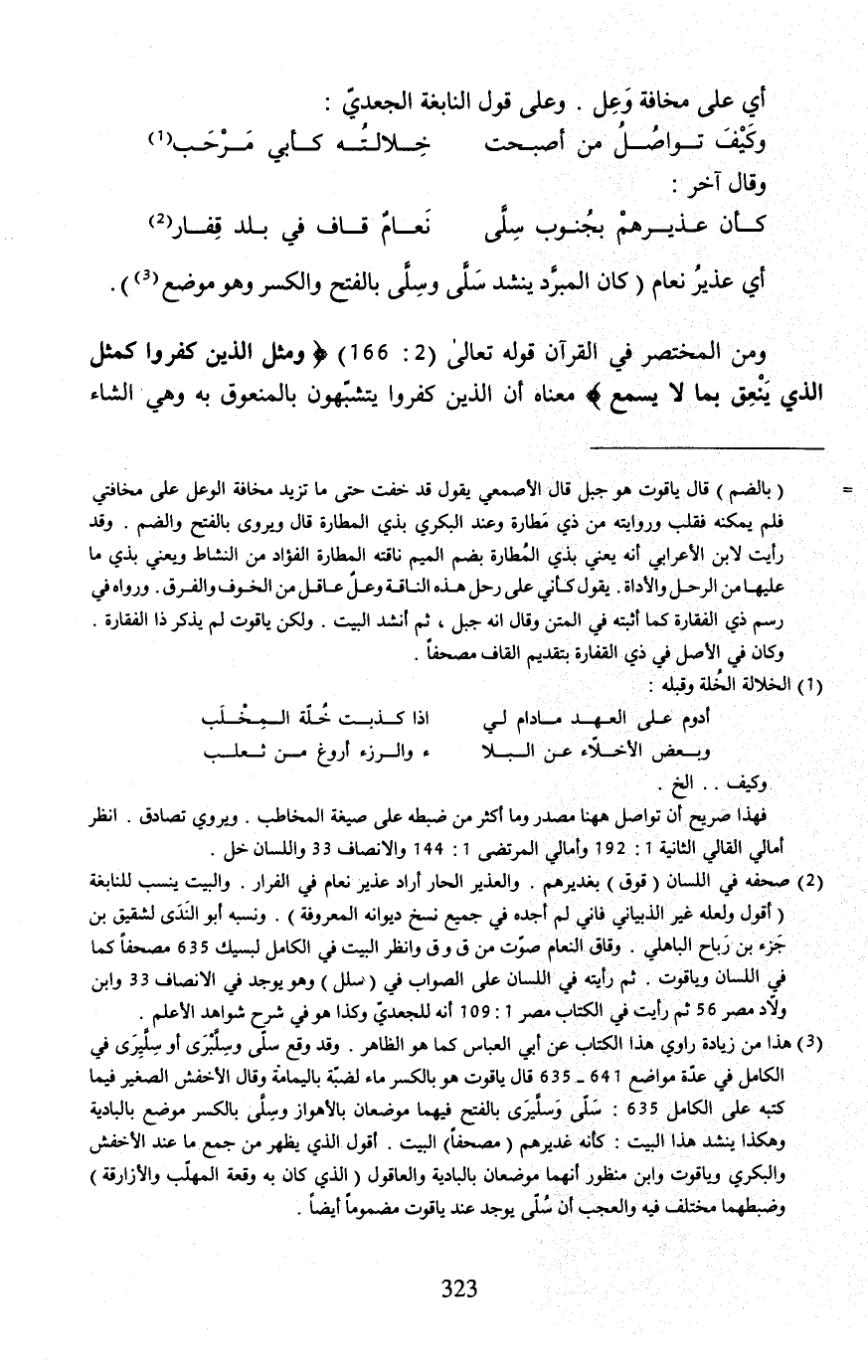 (¬2) صحفه في اللسان (قوق) بغديرهم. والعذير الحار أراد عذير نعام في الفرار. والبيت ينسب للنابغة (أقول ولعله غير الذبياني فإني لم أجده في جميع نسخ ديوانه المعروفة). ونسبه أبو النَدَى لشقيق بن جَزء بن رَباح الباهلي. وقاق النعام صوّت من ق وق وانظر البيت في الكامل لبسيك 635 مصحفًا كما في اللسان وياقوت. ثم رأيته في اللسان على الصواب في (سلل) وهو يوجد في الإنصاف 33 وابن ولّاد مصر 56 ثم رأيت في الكتاب مصر 1: 109 أنه للجعديّ وكذا هو في شرح شواهد الأعلم.