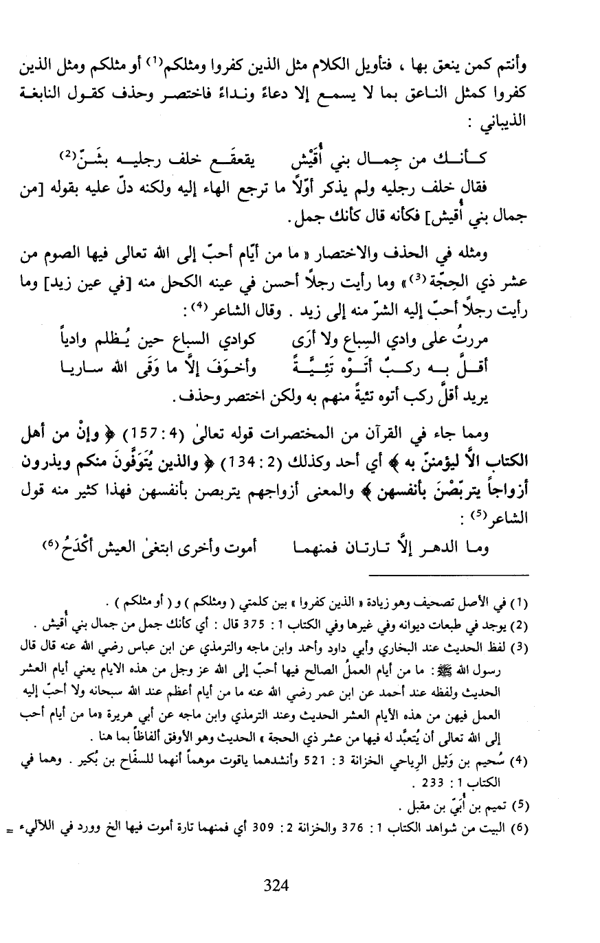 ومما جاء في القرآن من المختصرات قوله تعالى (4: 159) {وَإِنْ مِنْ أَهْلِ الْكِتَابِ إلا لَيُؤْمِنَنَّ بِهِ} أي أحد وكذلك (2: 234) {وَالَّذِينَ يُتَوَفَّوْنَ مِنْكُمْ وَيَذَرُونَ أَزْوَاجًا يَتَرَبَّصْنَ بِأَنْفُسِهِنَّ} والمعنى أزواجهم يتربصن بأنفسهن فهذا كثير منه قول الشاعر (¬5):