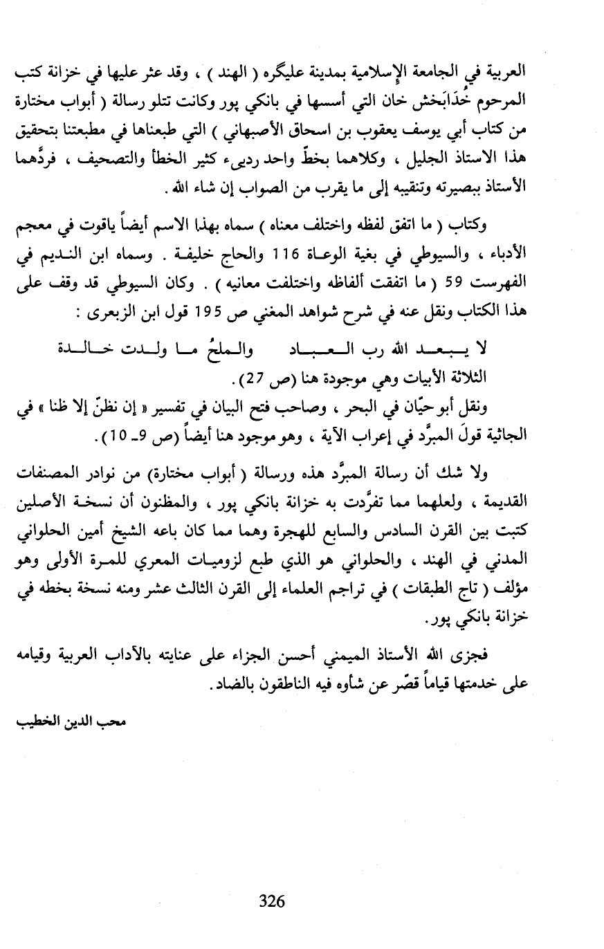 ولا شك أن رسالة المبرد هذه ورسالة (أبواب مختارة) من نوادر المصنفات القديمة، ولعلهما مما تفردت به خزانة بانكي بور، والمظنون أن نسخة الأصلين كتبت بين القرن السادس والسابع للهجرة وهما مما كان باعه الشيخ أمين الحلواني المدني في الهند، والحلواني هو الذي طبع لزوميات المعري للمرة الأولى وهو مؤلف (تاج الطبقات) في تراجم العلماء إلى القرن الثالث عشر ومنه نسخة بخطه في خزانة بانكي بور.