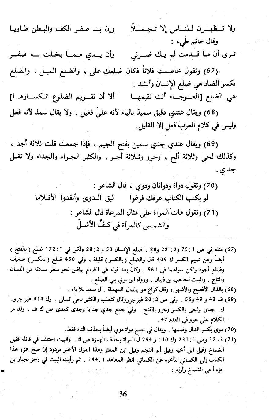 (67) مثله في ص 1: 75 و 2: 22 و 28. ضلع الإنسان و 53 و 28: 2 ولكن في 1: 172 ضلع (بالفتح) أيضًا وعن تميم الكسر ك 409 قال والضلع (بالكسر) قليلة، وفيه 450 ضلع (بالكسر) ضعيف وضلع أجود ولكن سواهما في 561. وكان بعد قوله هي الضلع بياض نحو سطر سددته من اللسان والتاج. والبيت لحاجب بن ذبيان، ورواه ابن بري بني الضلع.