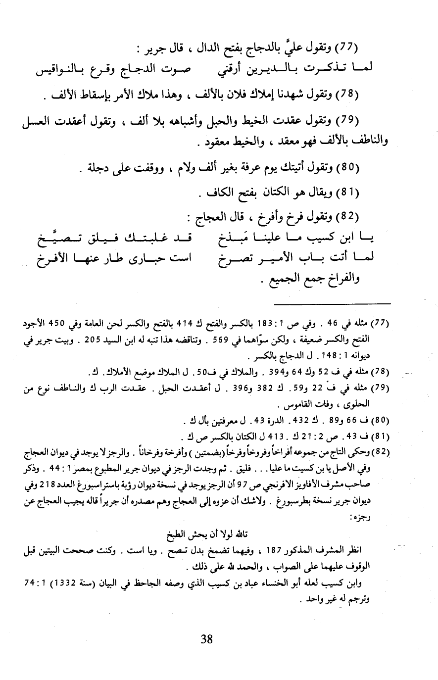 (77) مثله فيه 46. وفي ص 1: 183 بالكسر والفتح ك 414 بالفتح والكسر لحن العامة وفي 50 الأجود الفتح والكسر ضعيفة، ولكن سوْاهما في 569. وتناقضه هذا تنبه له ابن السيد 205. وبيت جرير في ديوانه 1: 148. ل الدجاج بالكسر.