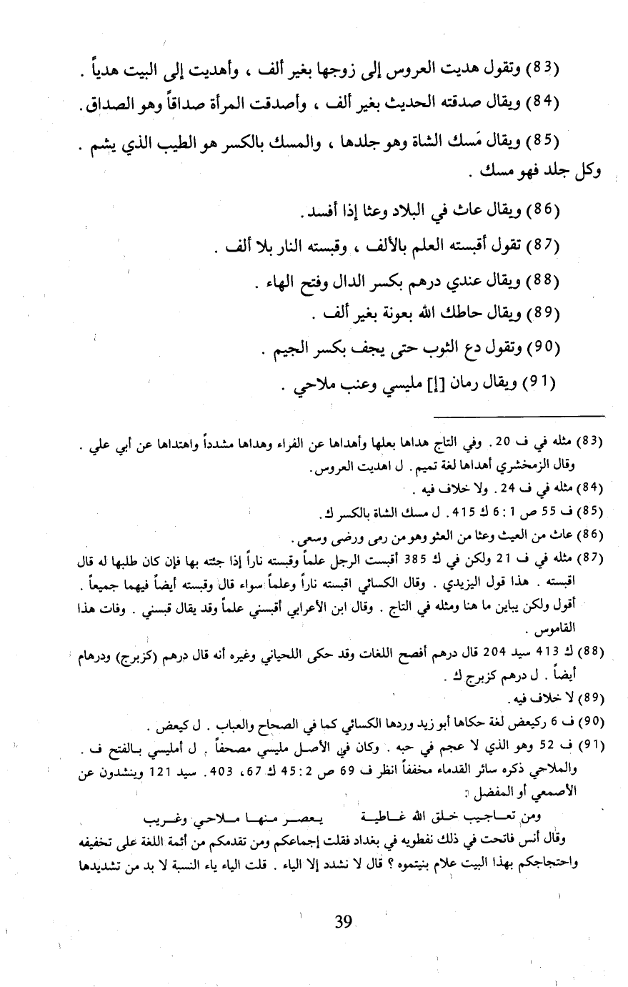 (88) ك 413 سيد 204 قال درهم أفصح اللغات وقد حكى اللحياني وغيره أنه قال درهم (كزبرج) ودرهام أيضًا. ل درهم كزبرج ك.