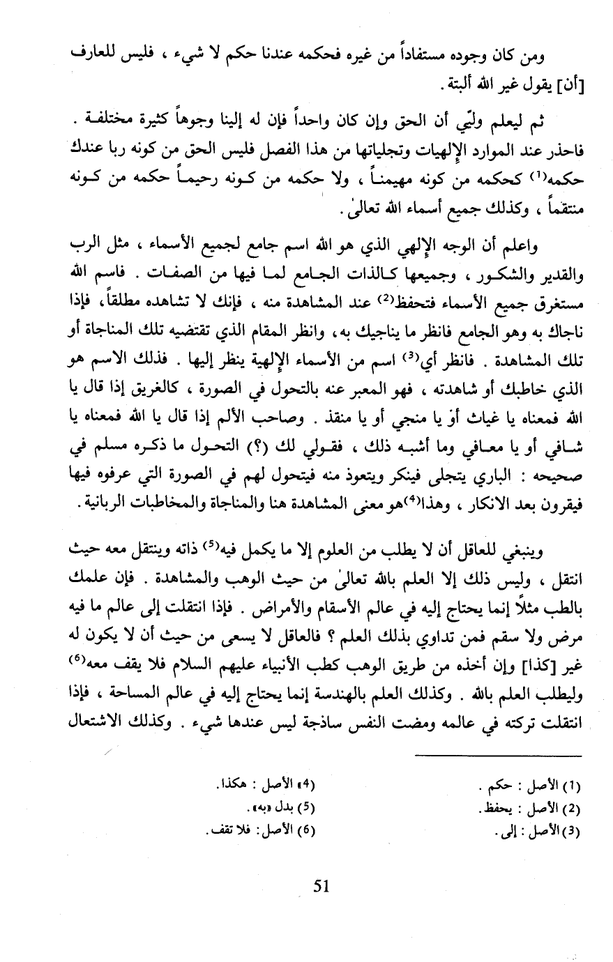 وينبغي للعاقل أن لا يطلب من العلوم إلا ما يكمل فيه (¬5) ذاته وينتقل معه حيث انتقل، وليس ذلك إلا العلم بالله تعالى من حيث الوهب والمشاهدة. فإن علمك بالطب مثلًا إنما يحتاج إليه في عالم الأسقام والأمراض. فإذا انتقلت إلى عالم ما فيه مرض ولا سقم فمن تداوي بذلك العلم؟ فالعاقل لا يسعى من حيث أن لا يكون له غير [كذا] وإن أخذه من طريق الوهب كطب الأنبياء عليهم السلام فلا يقف معه (¬6) وليطلب العلم بالله. وكذلك العلم بالهندسة إنما يحتاج إليه في عالم المساحة، فإذا انتقلت تركته في عالمه ومضت النفس ساذجة ليس عندها شيء. وكذلك الاشتعال