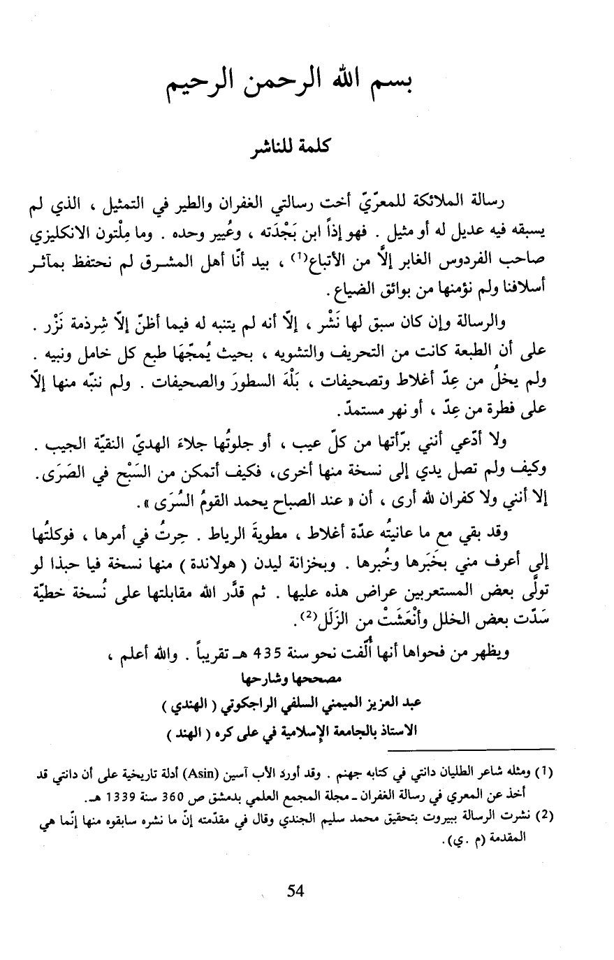 رسالة الملائكة للمعرّيّ أخت رسالتي الغفران والطير في التمثيل، الذي لم يسبقه فيه عديل له أو مثيل. فهو إذًا ابن بَجْدَته، وعُيير وحده. وما مِلْتون الإنكليزي صاحب الفردوس الغابر إلَّا من الأتباع (¬1)، بيد أنّا أهل المشرق لم نحتفظ بمآثر أسلافنا ولم نؤمنها من بوائق الضياع.