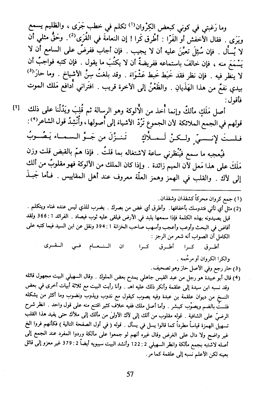 أصل مَلَكٍ مألكٌ وإنما أُخذ من الأُلوكة وهو الرسالة ثم قُلِبَ ويَدُلّنا على ذلك ... [1] قولهم في الجمع الملائكة لأن المجموع تَرُدّ الأشياءَ إلى أُصولها، وأُنْشِدُ قول الشاعر (¬4):