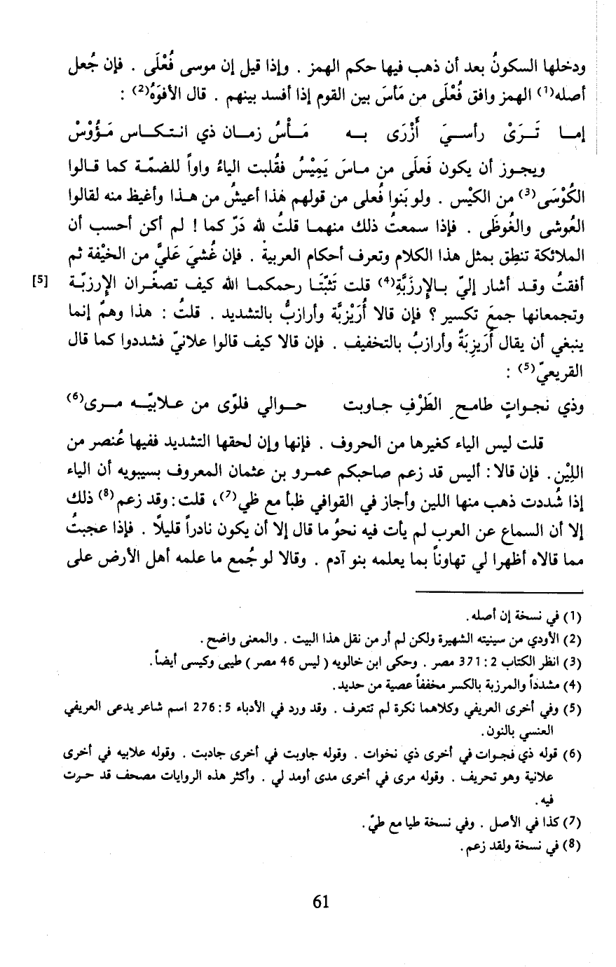 ويجوز أن يكون فَعلَى من ماسَ يَمِيسُ فقُلبت الياءُ واوًا للضمّة كما قالوا الكُوْسَى (¬3) من الكيس. ولو بَنوا فُعلى من قولهم هذا أعيشُ من هذا وأغيظ منه لقالوا العُوشى والغُوظَى. فإذا سمعتُ ذلك منهما قلتُ لله دَرّ كما! لم أكن أحسب أن الملائكة تنطِق بمثل هذا الكلام وتعرف أحكام العربية. فإن غُشيَ عَليَّ من الخيفة ثم أفقتُ وقد أشار إليّ بالإرزَبَّة (¬4) قلت تثبّتَا رحمكما الله كيف تصغّران الإرزبّة [5] وتجمعانها جمعَ تكسير؟ فإن قالا أُرَيزبَّة وأرازبُّ بالتشديد. قلتُ: هذا وهمٌ إنما ينبغي أن يقال أرَيزِبَةٌ وأرازبُ بالتخفيف. فإن قالا كيف قالوا علانيّ فشددوا كما قال القريعيّ (¬5):