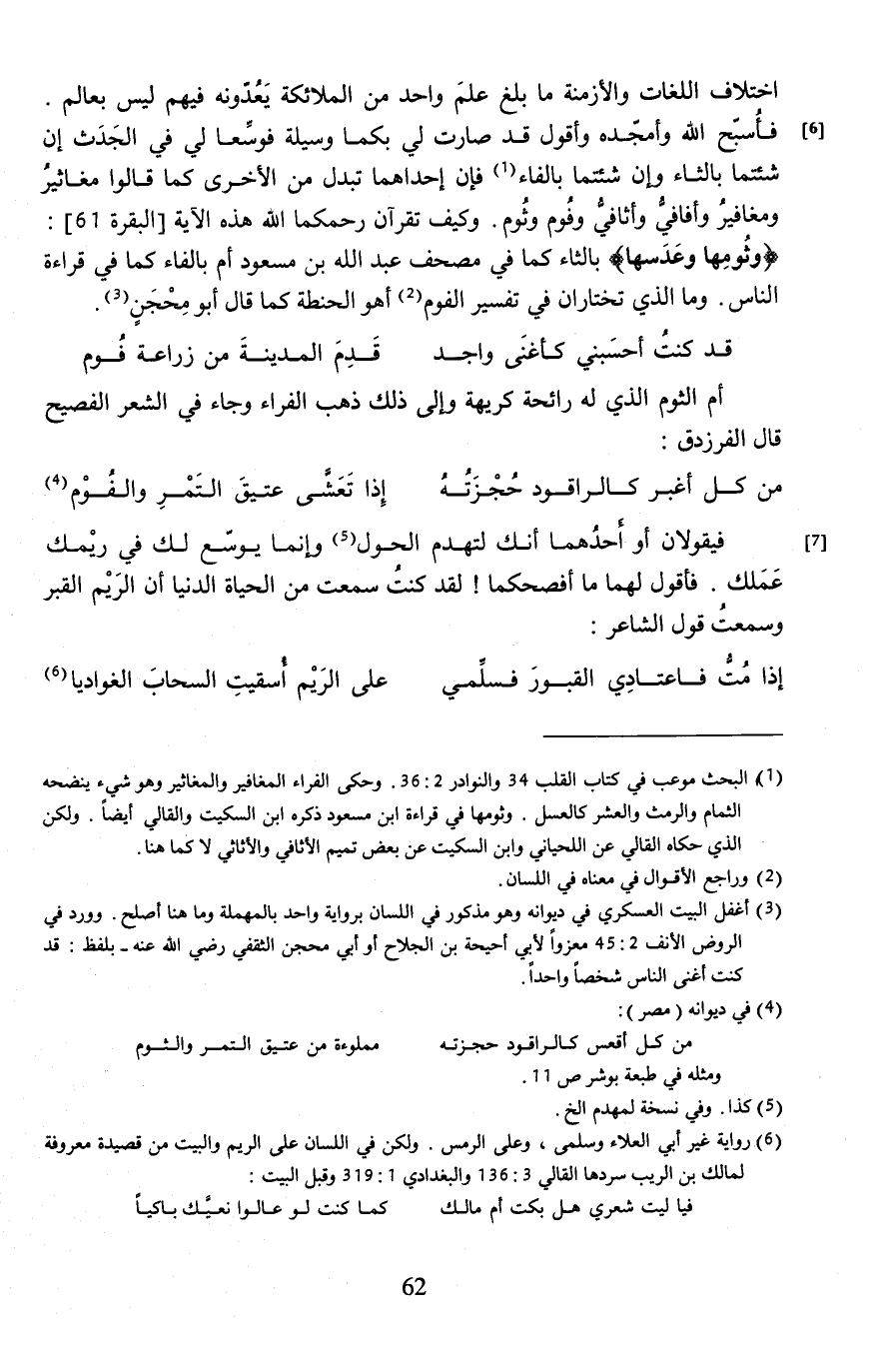 [6] فأُسبّح الله وأمجّده وأقول قد صارت لي بكما وسيلة فوسِّعا لي في الجَدَث إن شئتما بالثاء وإن شئتما بالفاء (¬1) فإن إحداهما تبدل من الأخرى كما قالوا مغاثيرُ ومغافيرُ وأفافيُّ وأثافيُّ وفُوم وثُوم. وكيف تقرآن رحمكما الله هذه الآية [البقرة 61]: {وَثُومِهَا وَعَدَسِهَا} بالثاء كما في مصحف عبد الله بن مسعود أم بالفاء كما في قراءة النَّاس. وما الذي تختاران في تفسير القوم (¬2) أهو الحنطة كما قال أبو مِحْجَنٍ (¬3).