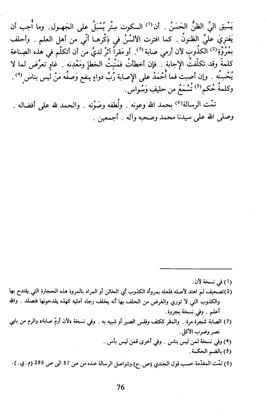 (¬6) تمّت المقدّمة حسب قول الجندي (ص. ح) وتتواصل الرسالة عنده من ص 57 إلى ص 286 (م. ي.).