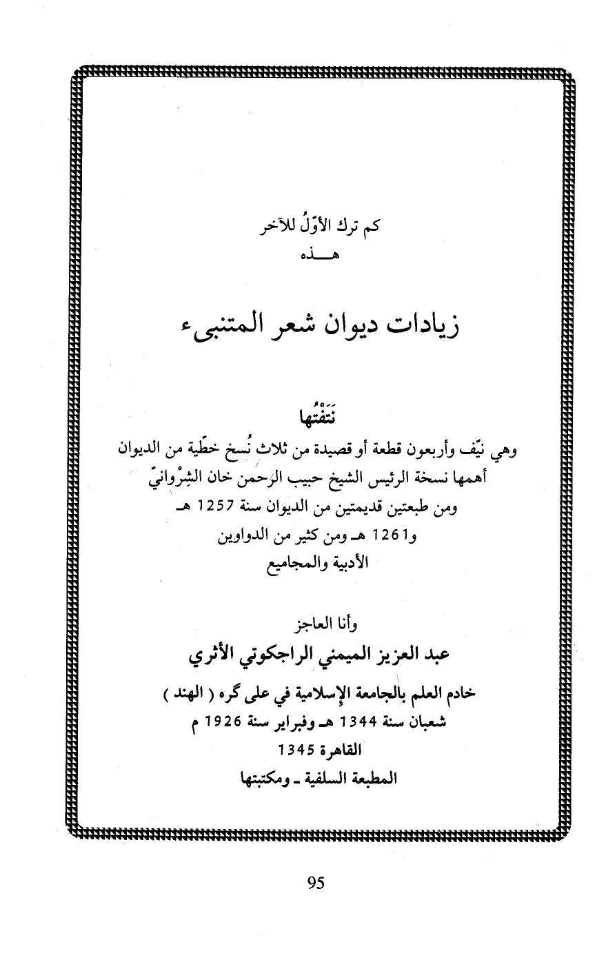 وهي نيّف وأربعون قطعة أو قصيدة من ثلاث نُسخ خطّية من الديوان أهمها نسخة الرئيس الشيخ حبيب الرحمن خان الشِرْوانيّ ومن طبعتين قديمتين من الديوان سنة 1257 هـ و 1261 هـ ومن كثير من الدواوين الأدبية والمجاميع