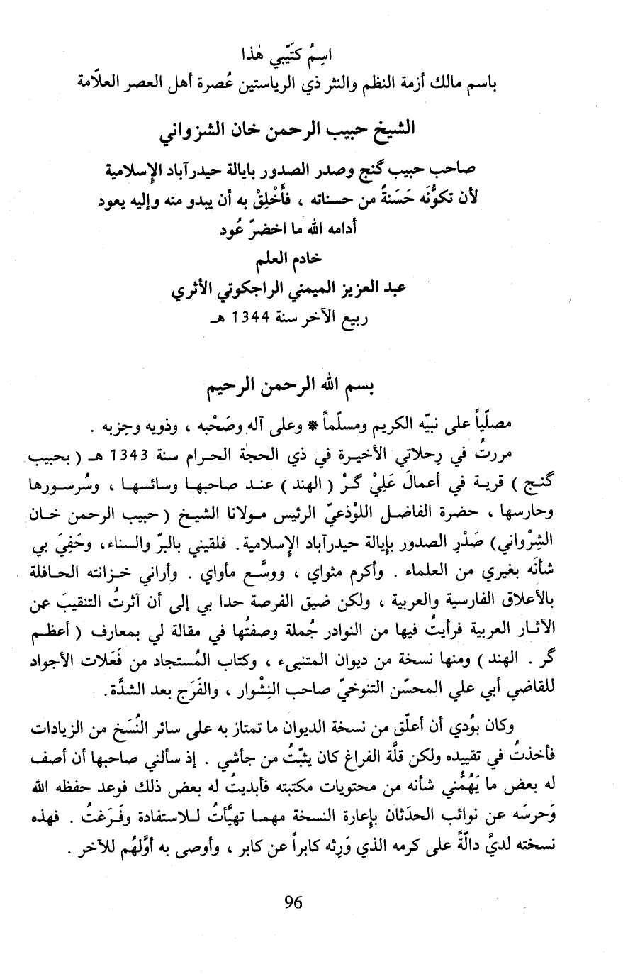 مررتُ في رِحلاتي الأخيرة في ذي الحجة الحرام سنة 1343 هـ (بحبيب كَنج) قرية في أعمال عَلِي كَرْ (الهند) عند صاحبها وسائسها، وسُرسورها وحارسها، حضرة الفاضل اللوْذعيّ الرئيس مولانا الشيخ (حبيب الرَّحْمَن خان الشِرْواني) صَدْرِ الصدور بإِيالة حيدر آباد الإِسلامية. فلقيني بالبرّ والسناء، وحَفِيَ بي شأنَه بغيري من العلماء. وأكرم مثواي، ووسَّع مأواي. وأراني خزانته الحافلة بالأعلاق الفارسية والعربية، ولكن ضيق الفرصة حدا بي إلى أن آثرتُ التنقيبَ عن الآثار العربية فرأيتُ فيها من النوادر جُملة وصفتُها في مقالة لي بمعارف (أعظم كَر. الهند) ومنها نسخة من ديوان المتنبيء، وكتاب المُستجاد من فَعَلات الأجواد للقاضي أبي علي المحسّن التنوخي صاحب النِشْوار، والفَرَج بعد الشدَّة.