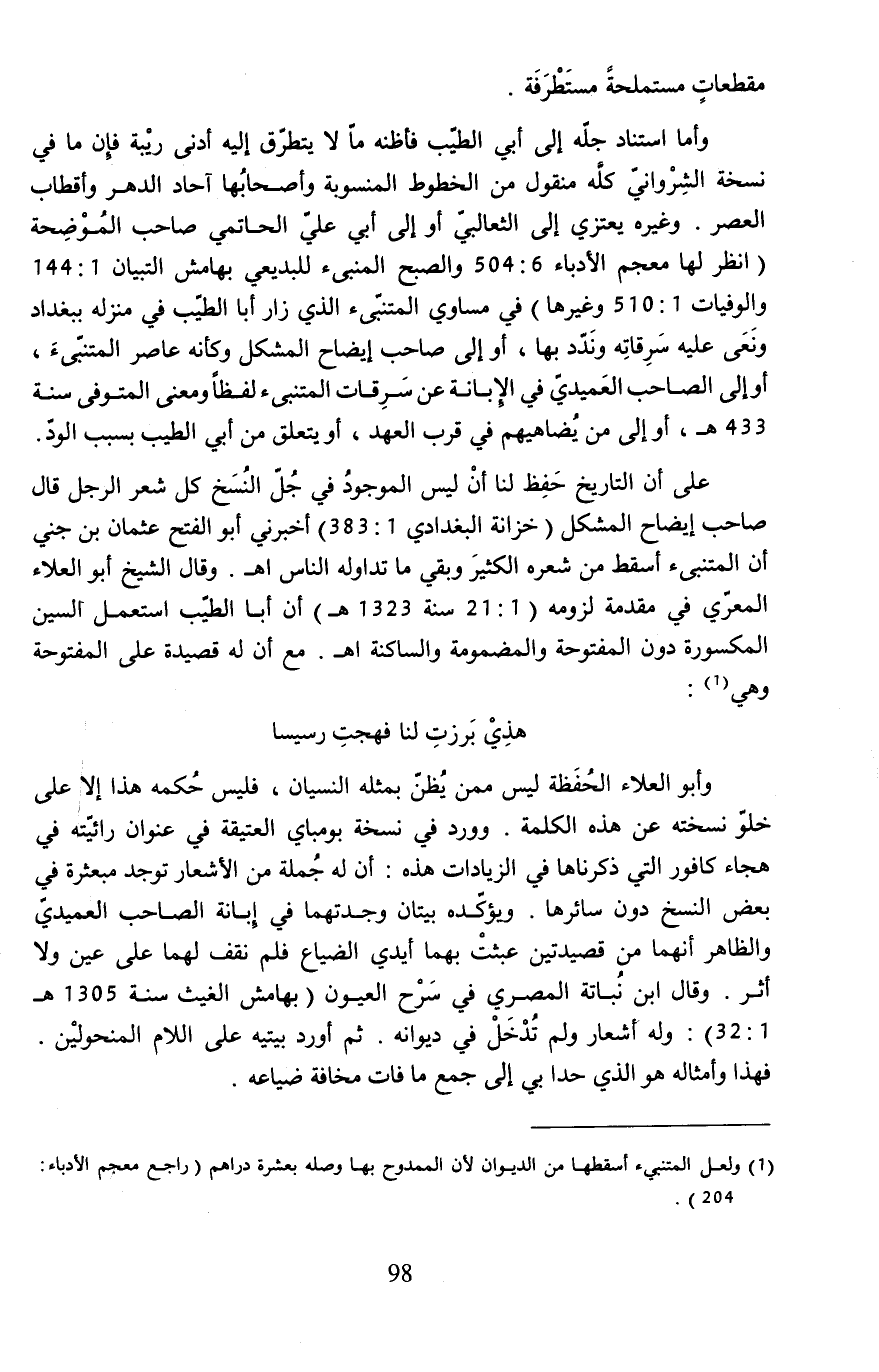 على أن التاريخ حَفِظ لنا أنْ ليس الموجودُ في جُلّ النُسَخ كل شعر الرَّجل قال صاحب إيضاح المشكل (خزانة البغدادي 1: 383) أخبرني أبو الفتح عثمان بن جني أن المتنبيء أسقط من شعره الكثيرَ وبقي ما تداوله النَّاس اهـ. وقال الشيخ أبو العلاء المعري في مقدمة لزومه (1: 21 سنة 1323 هـ) أن أَبا الطِّيب استعمل السين المكسورة دون المفتوحة والمضمومة والساكنة اهـ. مع أن له قصيدة على المفتوحة وهي (¬1):