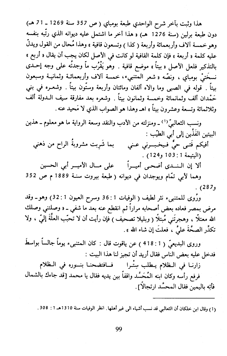 هذا وثبت بآخر شرح الواحدي طبعة بومباي (ص 357 سنة 1269 - 71 هـ). دون طبعة برلين (سنة 1276 هـ) "هذا آخر ما اشتمل عليه ديوانه الذي رتّبه بنفسه وهو خمسة آلاف وأربعمائة وأربعة (كذا) وتسعون قافية" وهذا مُحال من القول ويدل عليه كلمة "أربعة" فإن كلمة القافية لو كانت في الأصل لكان يجب أن يقال "أربع" بالتذكير فلعل الأصل "بيتًا" موضع قافية. وهو يَقْرُب ما وجدتُه على وجه إحدى نسخَتي بومباي، ونصه "شعر المتنبيء، خمسة آلاف وأربعمائة وثمانية وسبعون بيتًا. قوله في الصبي وما والاه ألفان ومائتان وأربعة وستون بيتًا. وشعره في بني حَمْدان أَلْف وثمانمائة وخمسة وثمانون بيتًا. وشعره بعد مفارقة سيف الدولة أَلْف وثلاثمائة وتسعة وعشرون بيتًا" اهـ وهذا هو الصواب الذي لا مَحيد عنه.