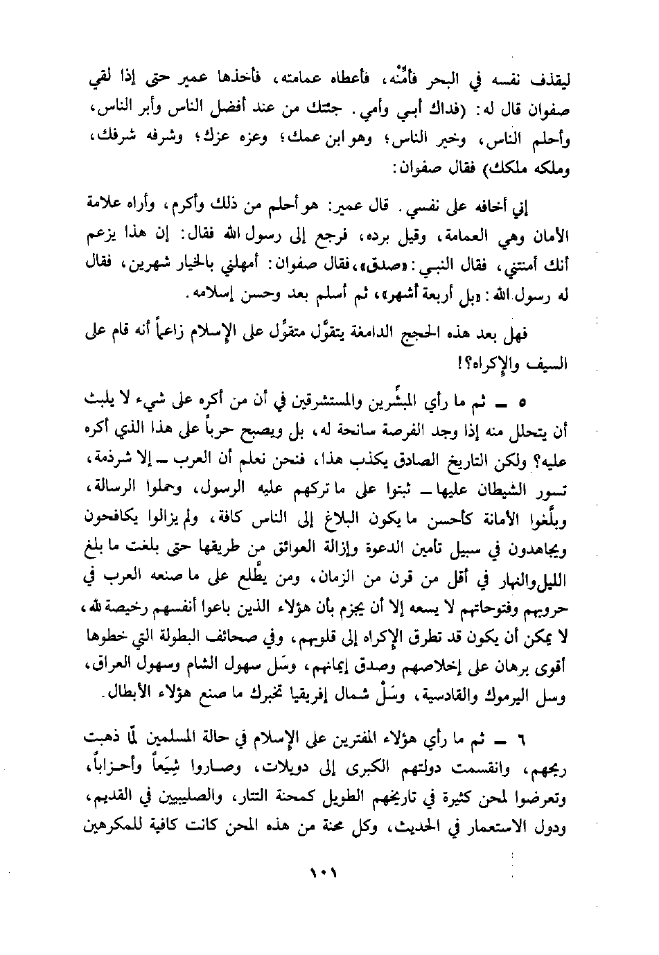 5- ثم ما رأي المبشّرين والمستشرقين في أن من أكره على شيء لا يلبث أن يتحلل منه إذا وجد الفرصة سانحة له، بل ويصبح حربا على هذا الذي أكره عليه؟ ولكن التاريخ الصادق يكذب هذا، فنحن نعلم أن العرب- إلا شرذمة، تسور الشيطان عليها- ثبتوا على ما تركهم عليه الرسول، وحملوا الرسالة، وبلّغوا الأمانة كأحسن ما يكون البلاغ إلى الناس كافة، ولم يزالوا يكافحون ويجاهدون في سبيل تأمين الدعوة وإزالة العوائق من طريقها حتى بلغت ما بلغ الليل والنهار في أقل من قرن من الزمان، ومن يطّلع على ما صنعه العرب في حروبهم وفتوحاتهم لا يسعه إلا أن يجزم بأن هؤلاء الذين باعوا أنفسهم رخيصة لله، لا يمكن أن يكون قد تطرق الإكراه إلى قلوبهم، وفي صحائف البطولة التي خطوها أقوى برهان على إخلاصهم وصدق إيمانهم، وسل سهول الشام وسهول العراق، وسل اليرموك والقادسية، وسل شمال إفريقيا تخبرك ما صنع هؤلاء الأبطال.
