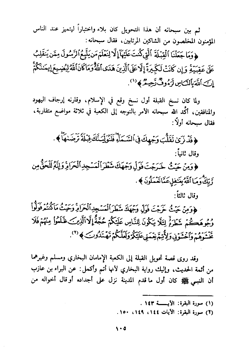 وَمِنْ حَيْثُ خَرَجْتَ فَوَلِّ وَجْهَكَ شَطْرَ الْمَسْجِدِ الْحَرامِ وَحَيْثُ ما كُنْتُمْ فَوَلُّوا وُجُوهَكُمْ شَطْرَهُ لِئَلَّا يَكُونَ لِلنَّاسِ عَلَيْكُمْ حُجَّةٌ إِلَّا الَّذِينَ ظَلَمُوا مِنْهُمْ فَلا تَخْشَوْهُمْ وَاخْشَوْنِي وَلِأُتِمَّ نِعْمَتِي عَلَيْكُمْ وَلَعَلَّكُمْ تَهْتَدُونَ «2» .