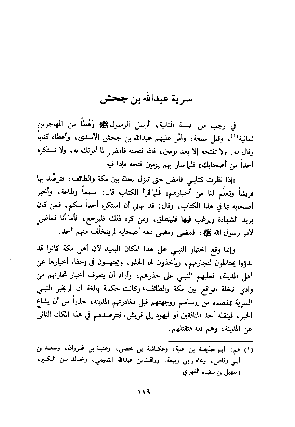 في رجب من السنة الثانية، أرسل الرسول صلى الله عليه وسلم رهطا من المهاجرين ثمانية «1» ، وقيل سبعة، وأمّر عليهم عبد الله بن جحش الأسدي، وأعطاه كتابا وقال له: «لا تفتحه إلا بعد يومين، فإذا فتحته فامض لما أمرتك به، ولا تستكره أحدا من أصحابك» فلما سار بهم يومين فتحه فإذا فيه: