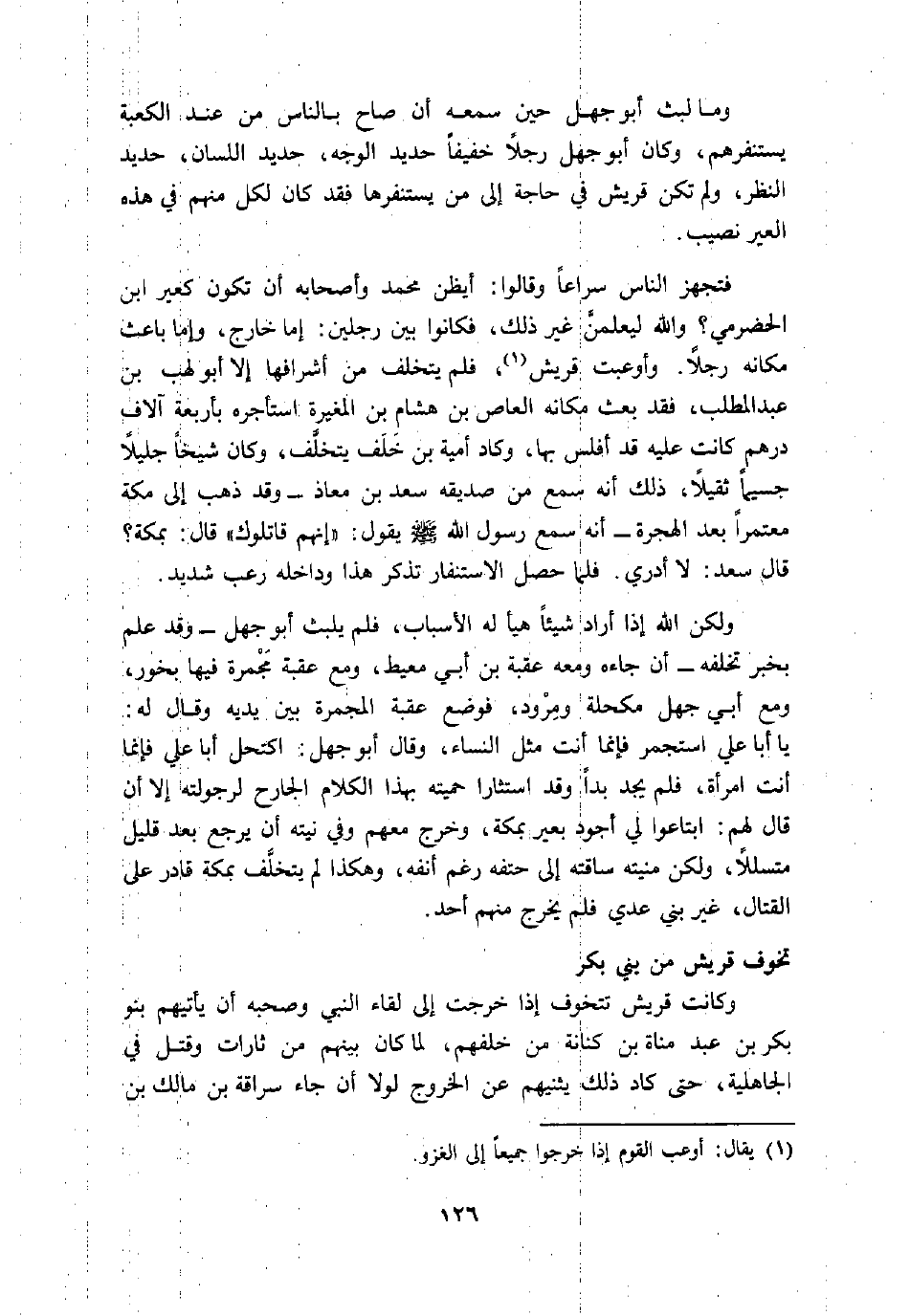 يا أبا علي استجمر فإنما أنت مثل النساء، وقال أبو جهل: اكتحل أبا علي فإنما أنت امرأة، فلم يجد بدا وقد استثارا حميته بهذا الكلام الجارح لرجولته إلا أن قال لهم: ابتاعوا لي أجود بعير بمكة، وخرج معهم وفي نيته أن يرجع بعد قليل متسللا، ولكن منيته ساقته إلى حتفه رغم أنفه، وهكذا لم يتخلّف بمكة قادر على القتال، غير بني عدي فلم يخرج منهم أحد.
