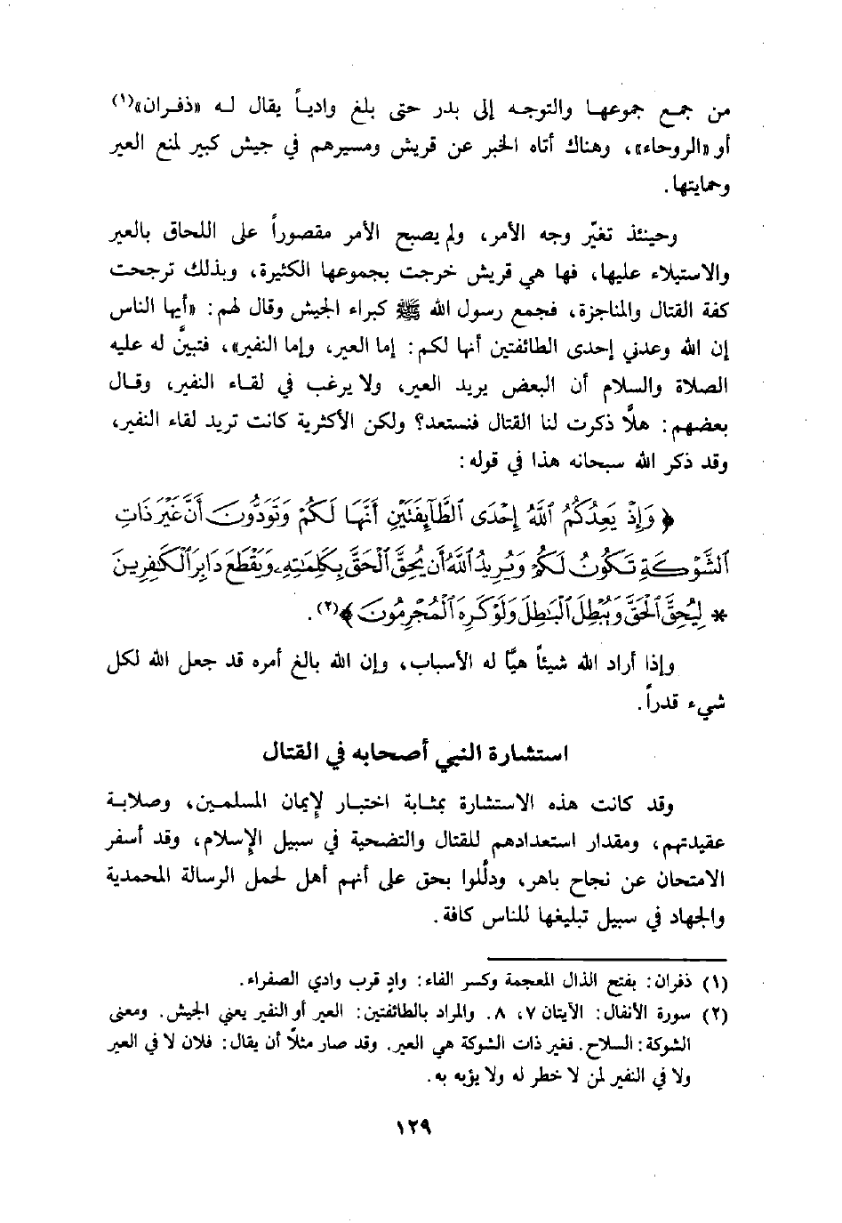 (2) سورة الأنفال: الايتان 7، 8. والمراد بالطائفتين: العير أو النفير يعني الجيش. ومعنى الشوكة: السلاح. فغير ذات الشوكة هي العير. وقد صار مثلا أن يقال: فلان لا في العير ولا في النفير لمن لا خطر له ولا يؤبه به.