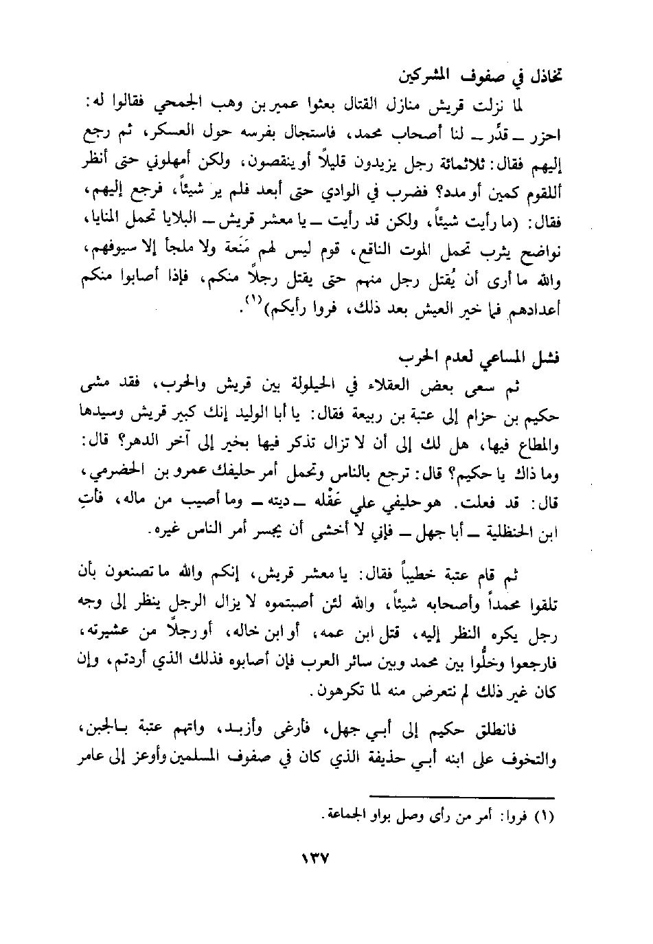 ثم قام عتبة خطيبا فقال: يا معشر قريش، إنكم والله ما تصنعون بأن تلقوا محمدا وأصحابه شيئا، والله لئن أصبتموه لا يزال الرجل ينظر إلى وجه رجل يكره النظر إليه، قتل ابن عمه، أو ابن خاله، أو رجلا من عشيرته، فارجعوا وخلّوا بين محمد وبين سائر العرب فإن أصابوه فذلك الذي أردتم، وإن كان غير ذلك لم نتعرض منه لما تكرهون.